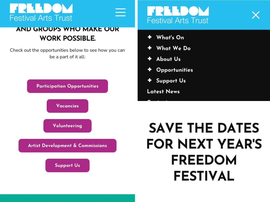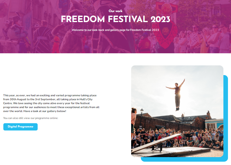 Examining the visual aesthetics of past festivals reveals insights into design choices that captured attention and conveyed the festival’s essence. This includes a thorough exploration of color schemes, imagery, and branding elements. In the website, we can see 5 parts,”the region’s largest internetional arts festival:freedom festival”;”the city comes alive again:the awakening”;”a thought-provoking large-scale monumental work:the hull vigil”and so on.From the short but powerful title, we can read and know what they want us to know.