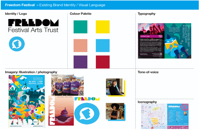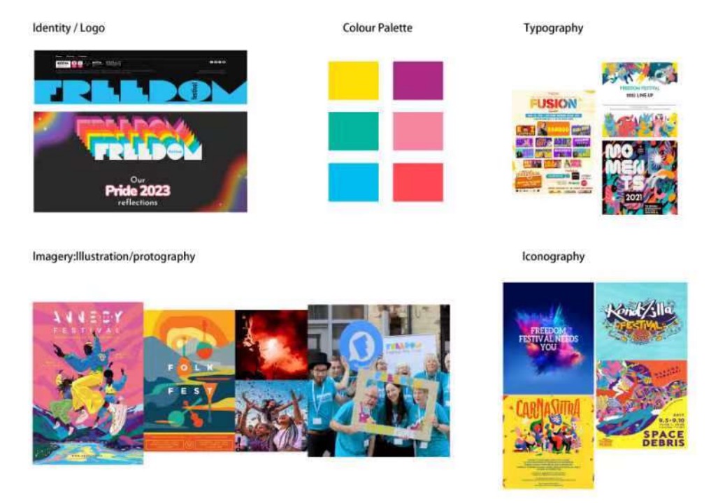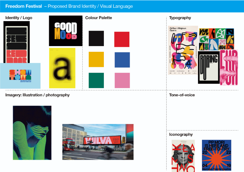 I have broken down the brand identity currently.In addition, I found some colors, logos and posters that I like and created an emotional version. In my opinion, the current brand logo is not very unique and its colors are too monotonous. I think it is more interesting to use color, which represents the liberalism of the Freedom Festival and is more energetic, and the logo with exaggerated deformed font is more interesting