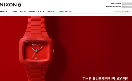 如下图所示,NIXON运动手表网站(www.nixonnow.com)主要以红色为主色调,搭配黑白作为点缀,营造出强烈的色彩对比。网站根据商家在一定时期内推出的不同产品,精心设计和安排了网站的色彩。图片中这款手表的颜色是鲜红色。为了与产品色调保持一致,设计师在网页上使用了深红色的相同配色方案,营造出暖色调的形象。