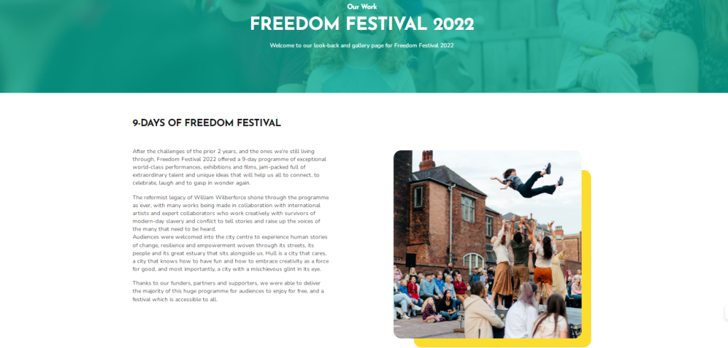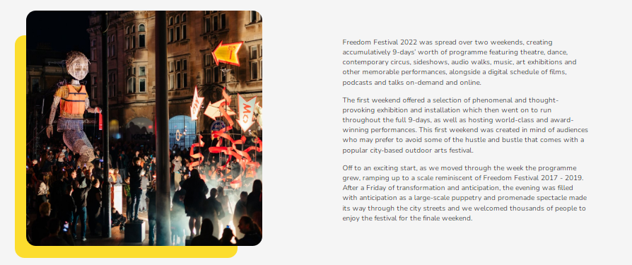 In 2023, its design, I think the activity web page is still more creative, like a magazine, spread out erery page,just like the life, We like to see the city.Every year, the festival is brought to life by the program, and the audience can also meet people from Outstanding artists from around the world. Its design is like an activity, free, open, enthusiastic, peaceful, different music performance, art performance, action performance, the disadvantage is that the evening activity design is a little lacking, and there is no particularly creative, fresh, recent popular activities. I will re-create the website and plan an activity that is fresh, interesting, nostalgic and futuristic.