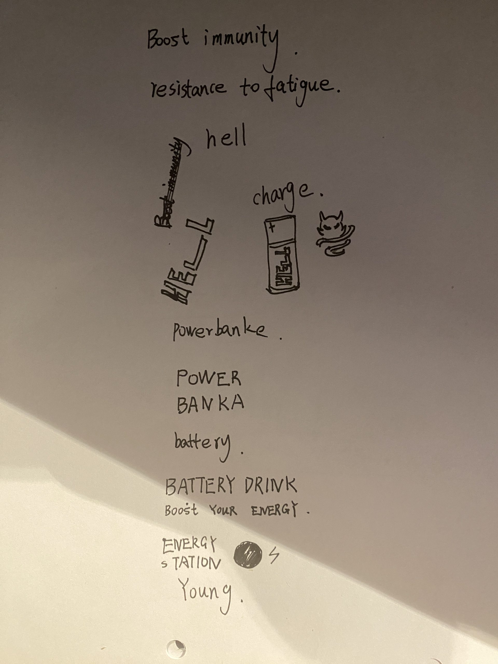 First of all, we need to think of an energy drink brand name. I wrote down a series of words related to energy and the elderly, emphasizing immunity enhancement, anti-fatigue, and mobile power. These concepts led me to think about power supply, and so I decided to call it “Charging.” I believe the name is simple, memorable, and implies a feeling of energy-boosting after consumption. It is especially suitable for the elderly who may feel physically weak and in need of a quick pick-me-up, like a good charging.